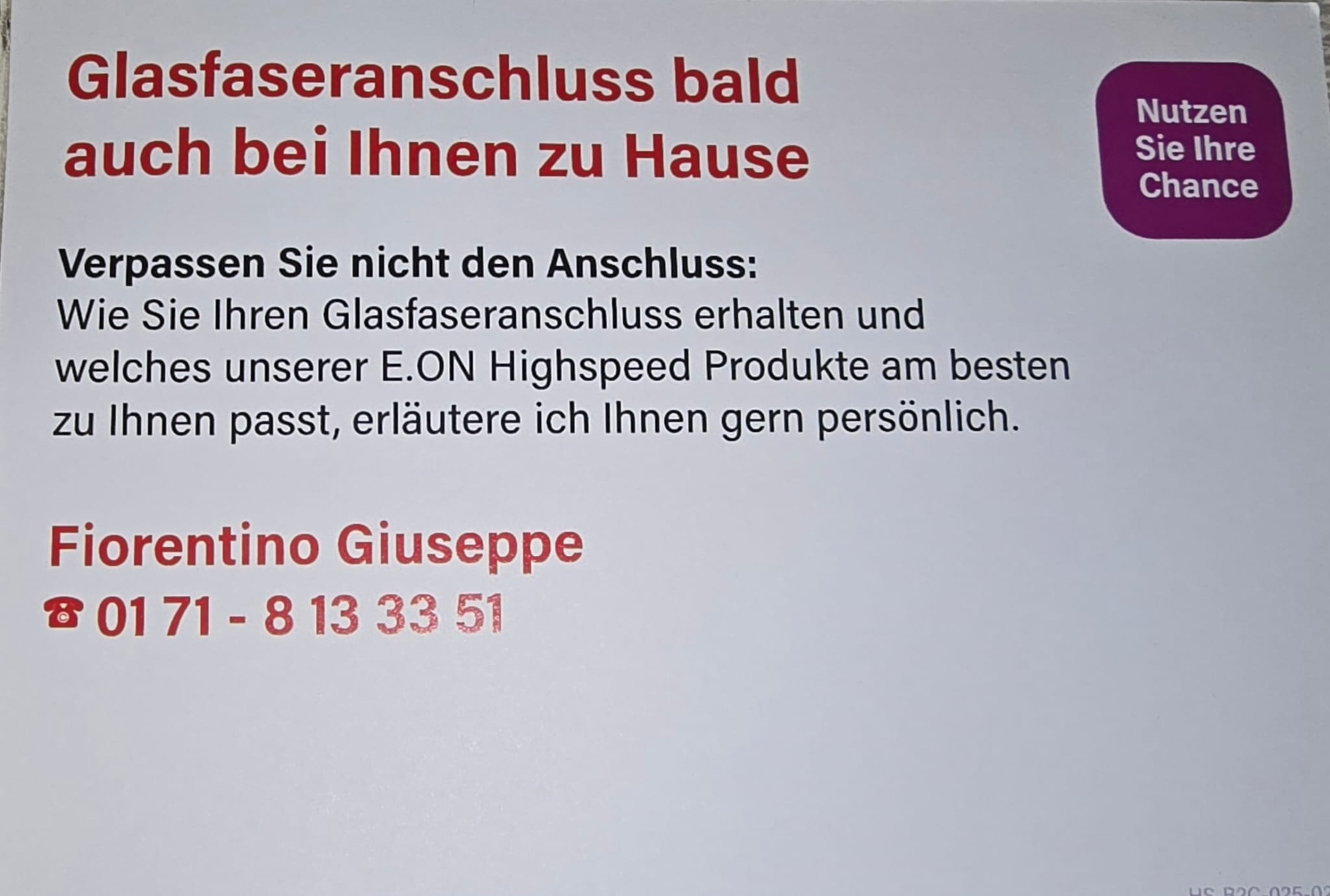 Derzeit ist ein Mitarbeiter der e.on, Herr Giuseppe Fiorentino, in Calenberg, Dalheim, Herlinghausen unterwegs und fragt das Interesse an einem Glasfaserhausanschluss ab.