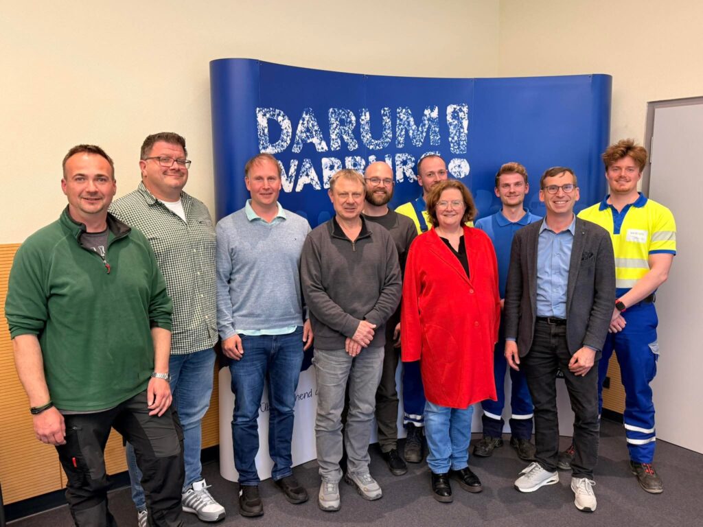 André Flore (Ortsvorsteher Dalheim), Ansgar Bodemann (Ortsvorsteher Calenberg), Alexander Neumann (Ortsvorsteher Herlinghausen), Hermann-Josef Dierkes (Koordinator Breitbandausbau Stadtwerke Warburg), Eric Volmert (Glasfaserkoordinator Hansestadt Warburg), Stanislav Kimmerle (Netzplanung Westconnect), Birgit Büscher (Westconnect Kommunalmanagement), Niels Gehring (Westconnect Netzplanung), Bürgermeister Tobias Scherf und Julien-Alexander Köster (Projektleitung Westnetz) freuen sich über die geschaffene Grundlage für den Glasfaserausbau in Calenberg, Dalheim und Herlinghausen.